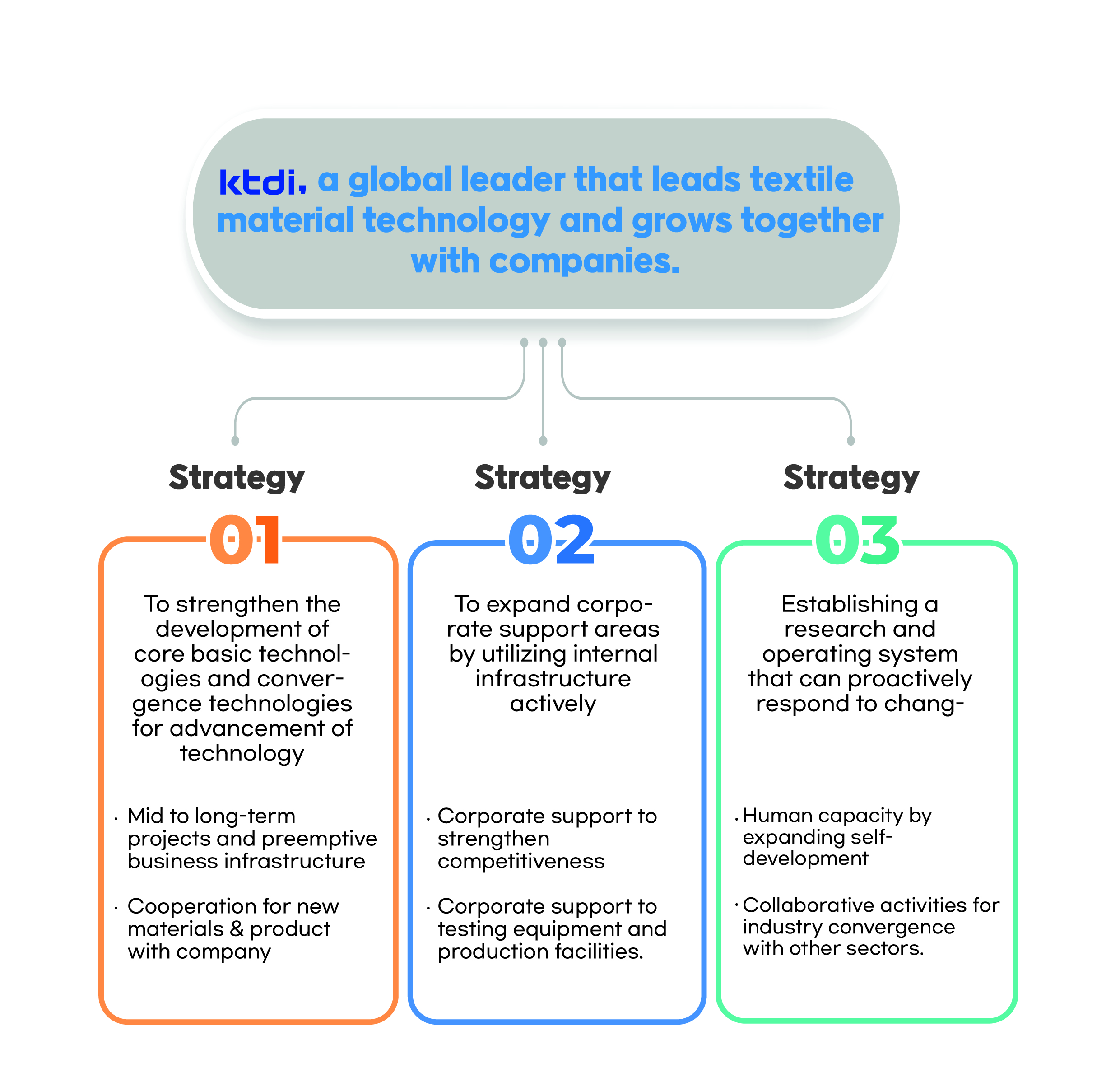 Driving the development of the textile industrythe best textile research instituteThe textile industry is a key industry that plays a driving role in the development of the national economy and occupies a large proportion in terms of the number of companies and employment, and has a great ripple effect in the front and rear.The Korea Textile Development Institute, which leads the era of the 4th industrial revolution, boasts the longest history and tradition among domestic textile-related research institutes, and all employees are doing their best to fulfill their mission and duties.The Korea Textile Development Institute is strengthening its capabilities for constant technological innovation and practical corporate support to leap to become the 'Best Global Convergence Materials Research Institute' as a research institute located at the top of the fiber stream and to serve as a 'affiliated research institute' to lead the growth of companies.KTDI will be a research institute that provides leading technological innovation in the textile industry and the support companies need.